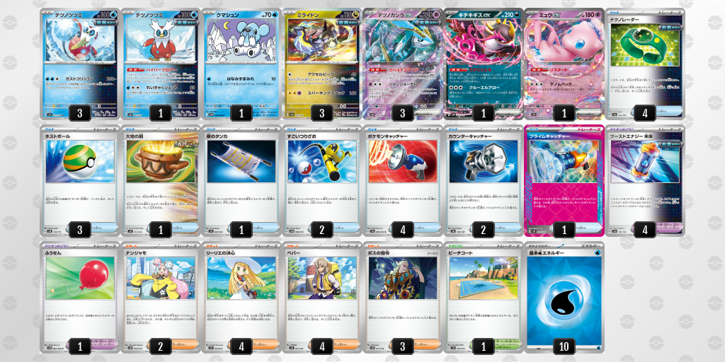 | コメント | どうしてもハイパーブロアー以外のテツノツツミが使いたくて組んだデッキ。たねポケモンで200ダメージ+αを出せるという、そこだけ見ると破格の性能をしたガストコリジョンを使うために周りを固めた。基本的には未来バレットの動きで、大量の裏呼びカードを使いながらHP200近辺のたねexをガストコリジョンで破壊することを目指している。 クマシュンは、にげるを強要することでラティアスなどのにげるエネルギー軽減を使わせるために入っている。サーナイトやジェットエネルギーの入ったデッキは天敵。 テクノレーダーやブーストエナジーがレギュGにて卒業のため、レギュH以降はまた別の方法でガストコリジョンを撃つつもり。 |